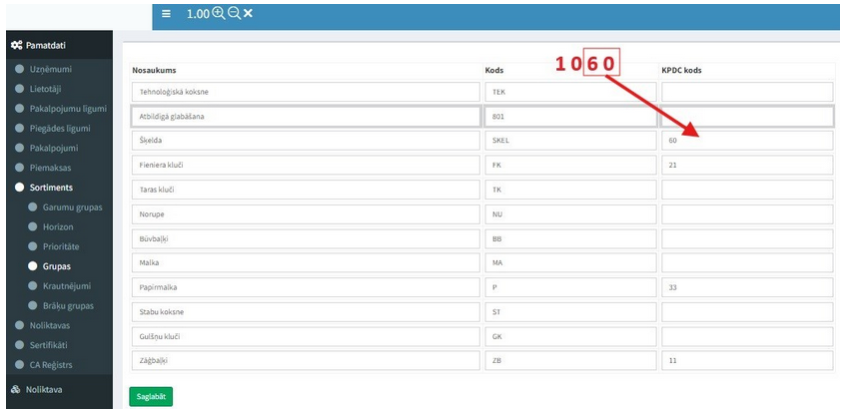 2) Pamatdati → Sortiments → Grupas KPDC kods