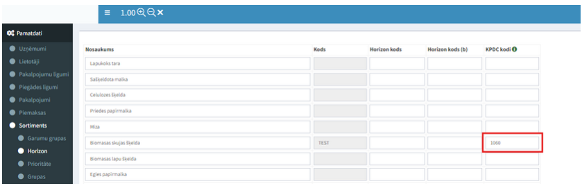 Piemērs: 1060 = Skujkoki Kurināmās šķeldas KPDC kodu klasifikators: https://kpdc.lv/kodi-un-klasifikatori