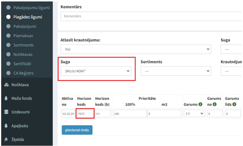 4) Pamatdati → Piegādes līgumi. Rindām jāatbilst sugai un attiecīgajam Horizon kodam pret ko piemeklēs KPDC uzmērījumu pret līguma rindu. (Šis solis jāaizpilda, ja izmantojat Noliktavas sadaļu)