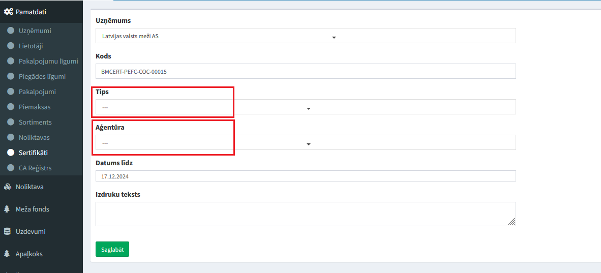 6) Pamatdati → Sertifikāti jāaizpilda sertifikāta Tips un Aģentūra